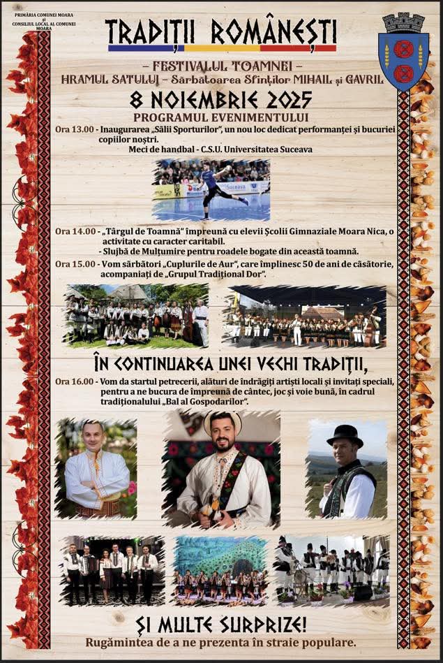 Comuna Moara va sărbători de hram cu un Festival al Toamnei și balul gospodarilor, evenimente pregătite de Primărie și Consiliul Local pentru o zi plină de manifestări speciale. Festivitatea începe sâmbătă, la ora 13.00, cu inaugurarea noii Săli a Sporturilor din centrul comunei.